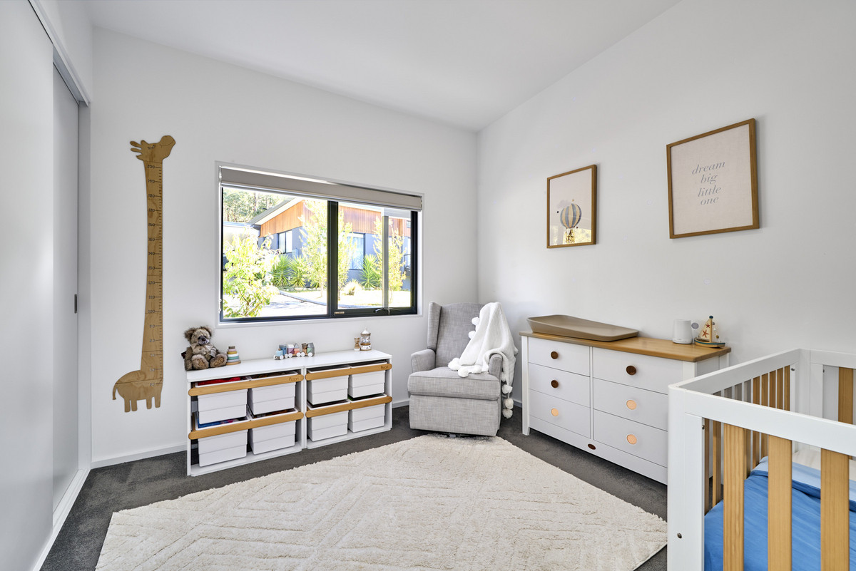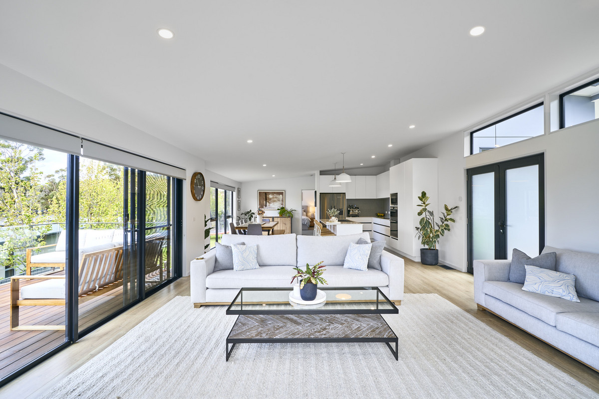 Surrounding the home, fully landscaped and fenced grounds create a serene garden setting, seamlessly merging natural textures with functional design. The home’s elevated position, orientation and limited number of neighbouring dwellings — just three on the allotment — enhance its enviable sense of seclusion.