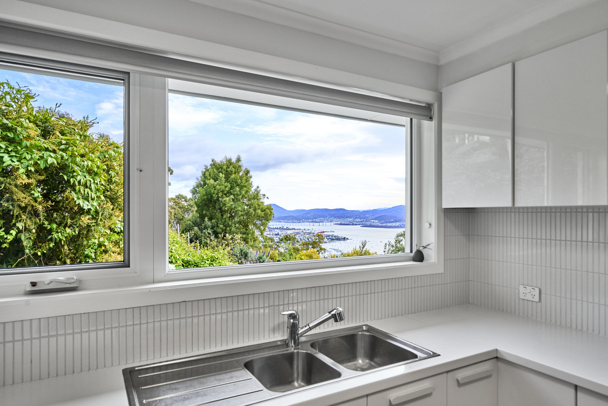The kitchen is stylish and well-appointed with premium Siemens appliances, LED lighting and stone benchtops – every detail has been considered, right down to the sink with a breathtaking view over Sandy Bay and the glistening CBD.