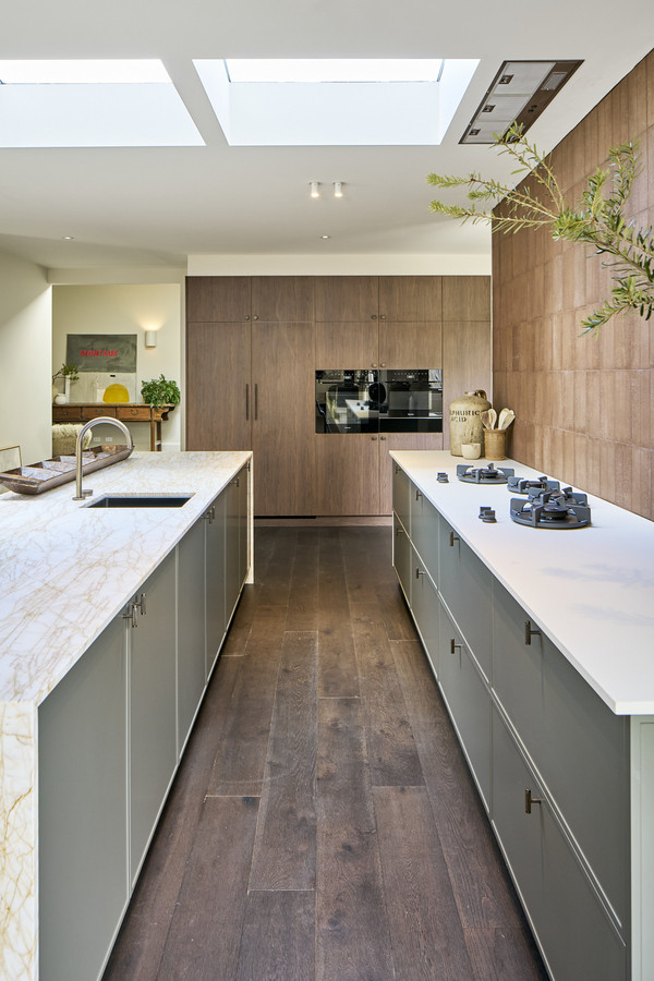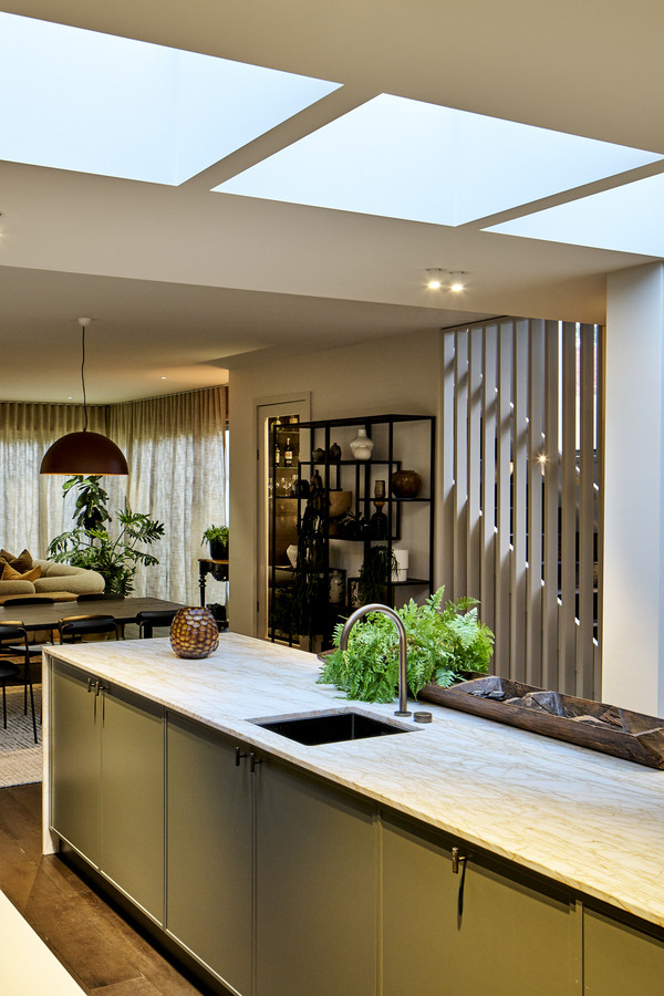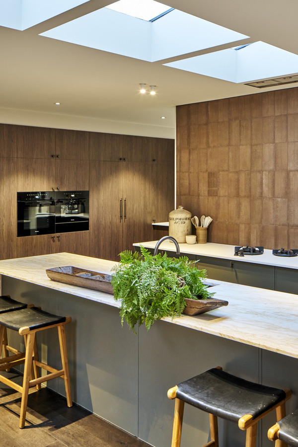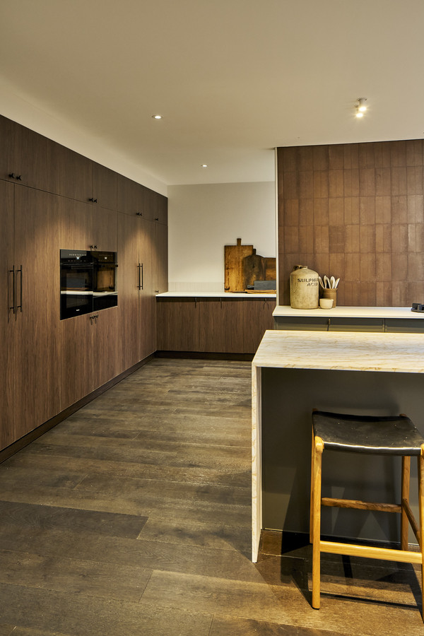 Through the second living room, or from the garage, leads the expansive kitchen, dining and living room framed by thoughtful picture frame windows, skylights and large sliding double glazed doors. The incredible kitchen space is an entertainer and chefs dream, a large, functional space filled with natural light. The kitchen offers guests instant boiling and chilled water and has fully integrated Miele appliances throughout. Including convection oven, microwave, pyrolitic oven, warming draw, fridge, freezer and dual dishwashers. Walnut cabinetry and Zaragoza natural stone bench tops frame this one-of-a-kind kitchen, completed with gas Pitt Burner cooking system handmade from the Netherlands.