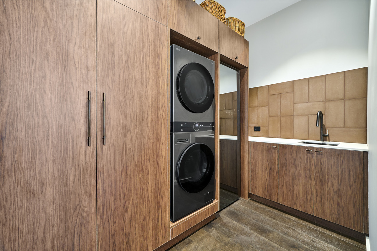 Also on the entry level is the garage with internal access, lead into the home by exposed brick-work, and is conveniently close to both the storage room and bespoke laundry. The laundry room also features the signature walnut cabinetry and features an LG Styler Steam Clothing Care System and LG Washer Dryer, both included.
